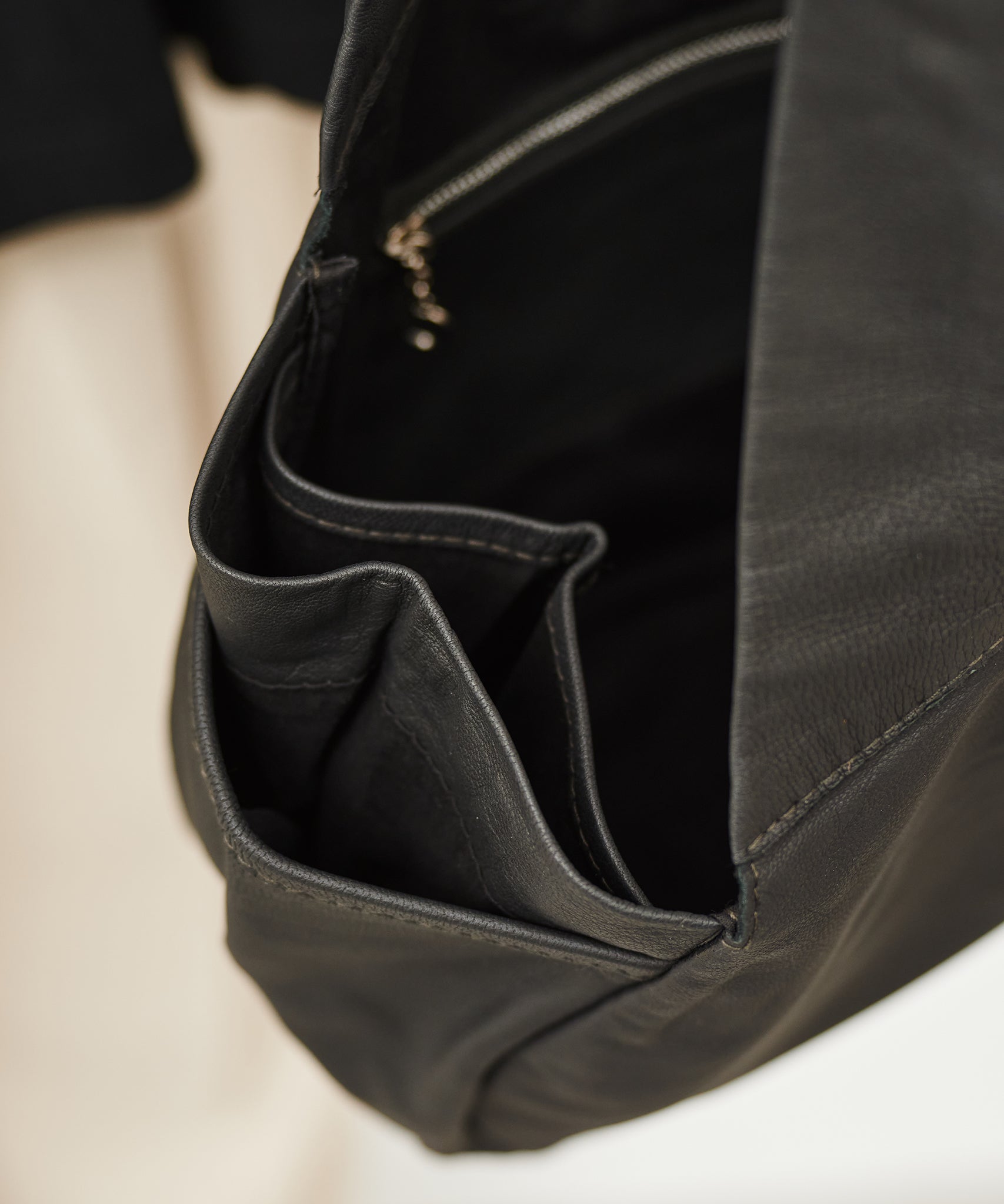 If worn with denim, indigo-dyed or cotton clothing, the color of the clothing may transfer to the leather due to friction. Also, if the bag gets wet due to rain, sweat, or friction, the color of the leather may transfer to your clothing. Please be careful when matching the bag with bright clothing.