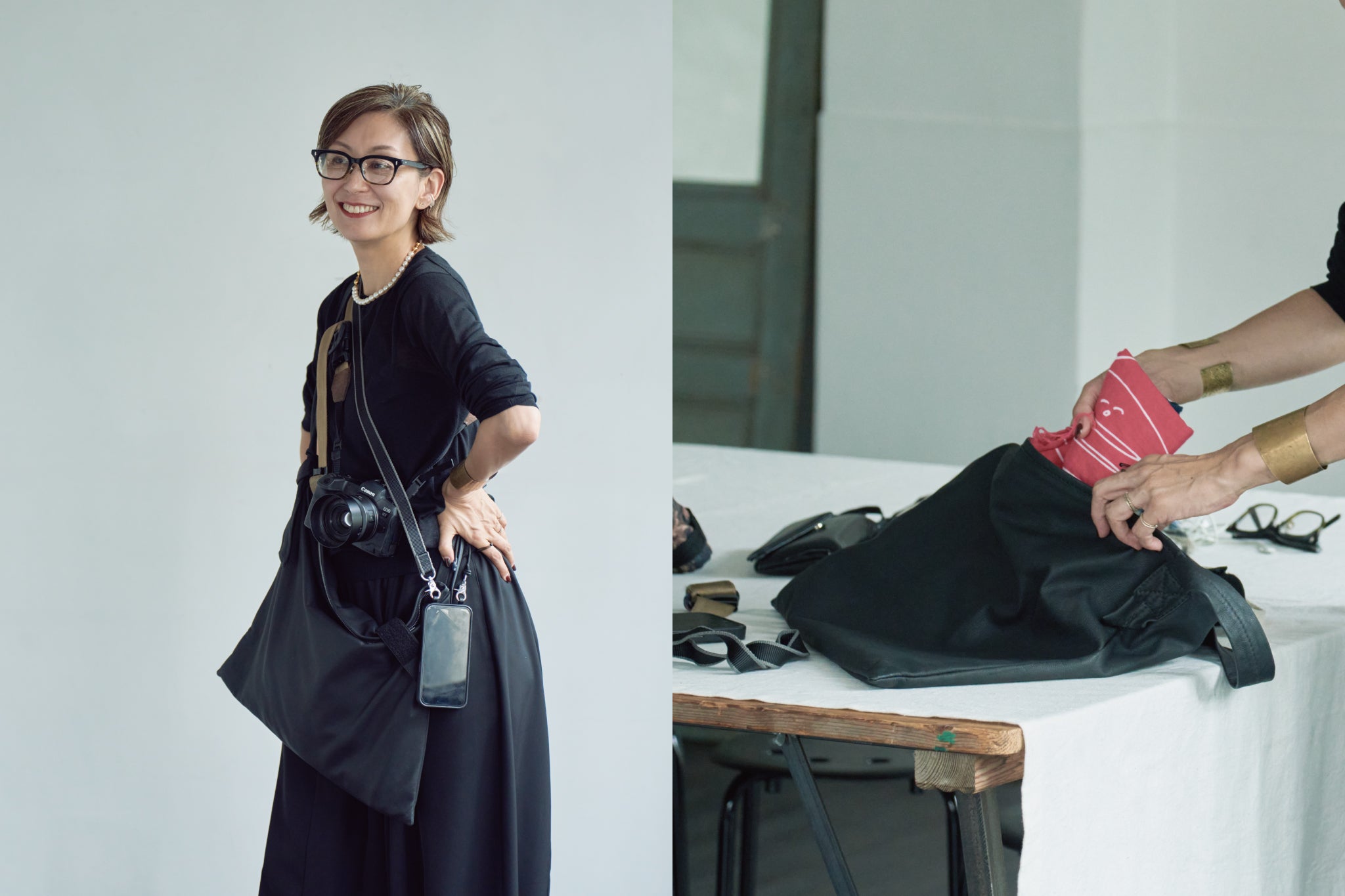 It’s lightweight and soft, and the two inner pockets are attached from the bottom, so it holds more than it looks. It’s very practical and easy to use.