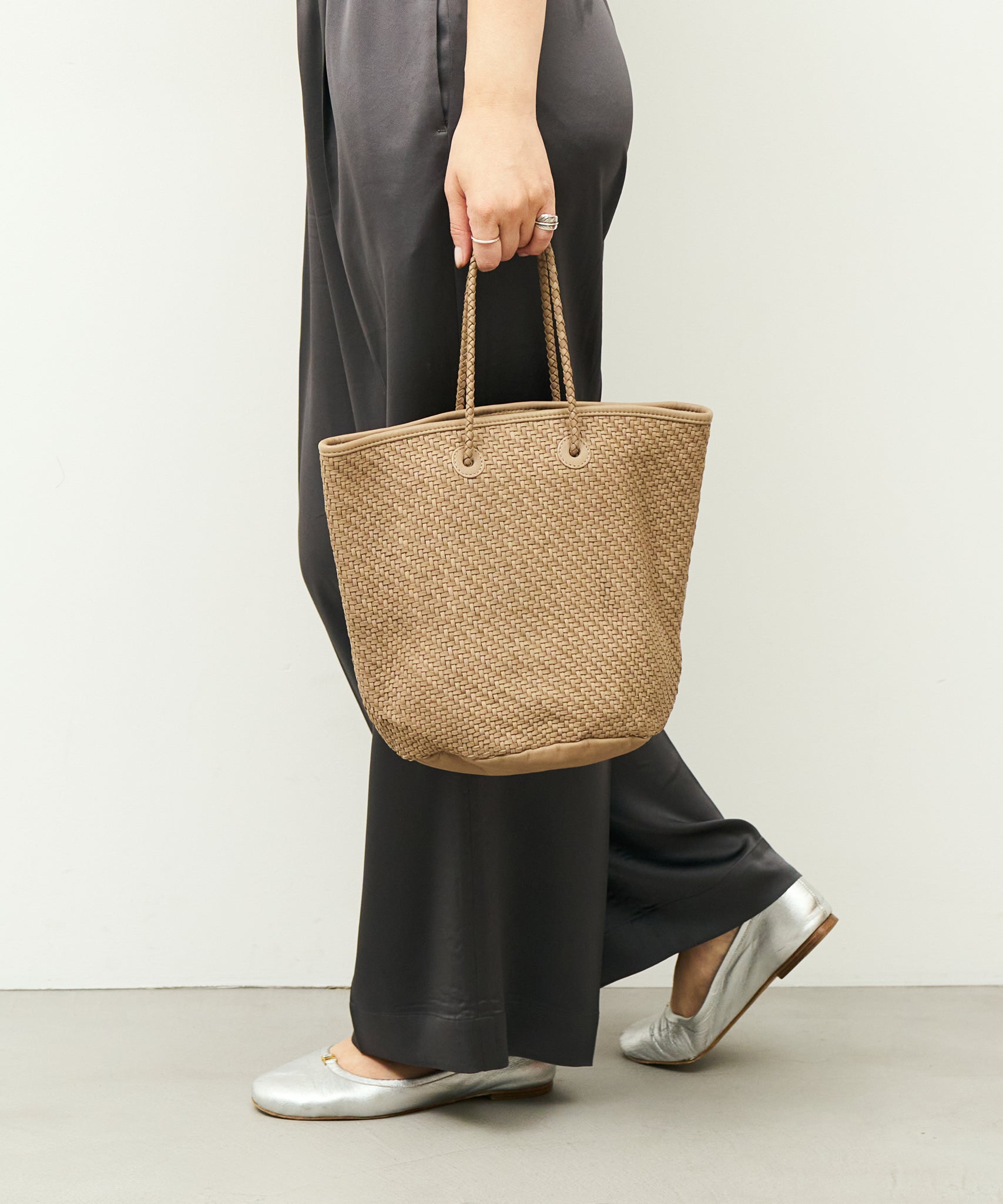 原本用來製作手套的羊皮,採用網代編織技術,編織成一整塊皮革網眼。這種編織方法類似於服裝的編織和縫紉工藝,即將皮革編織成一整塊,然後進行裁剪和縫紉。為了充分利用生皮柔軟的質感,添加了比普通更多的油。用於調整顏色的顏料也與油混合,並噴灑得非常薄,使其與皮革網眼融為一體,追求彷彿被手吸收的觸感。這件作品是在印度一家專門從事皮革網眼成型的工匠聚集的工作室的協助下完成的。