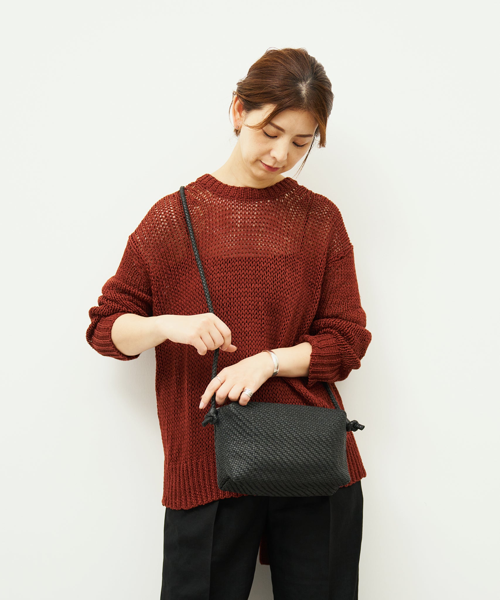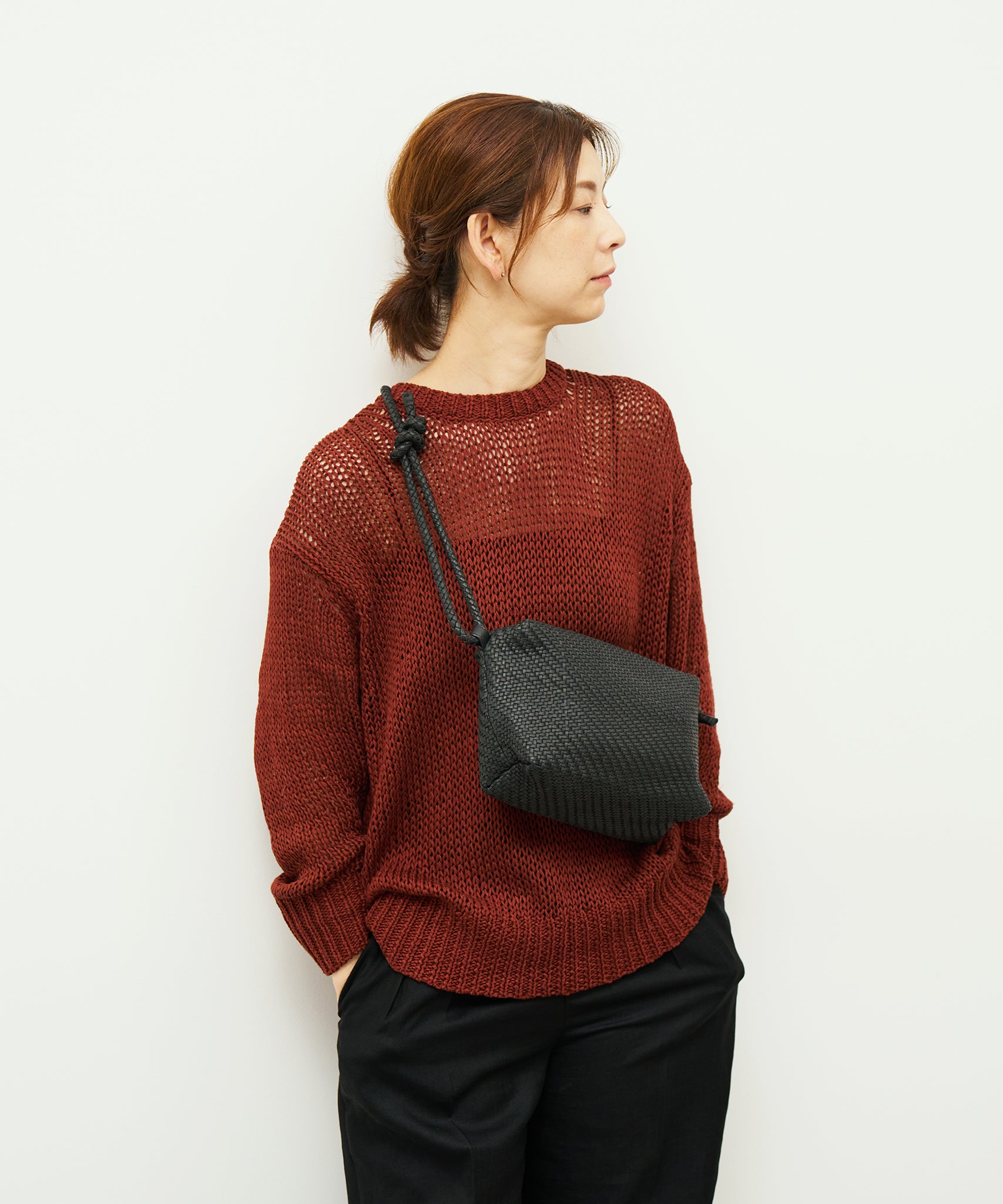 原本用來製作手套的羊皮,採用網代編織技術,編織成一整塊皮革網眼。這種編織方法類似於服裝的編織和縫紉工藝,即將皮革編織成一整塊,然後進行裁剪和縫紉。為了充分利用生皮柔軟的質感,添加了比普通更多的油。用於調整顏色的顏料也與油混合,並噴灑得非常薄,使其與皮革網眼融為一體,追求彷彿被手吸收的觸感。這件作品是在印度一家專門從事皮革網眼成型的工匠聚集的工作室的協助下完成的。